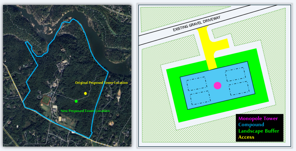 Update #14 (3/31/26): Based on feedback received during community outreach, an adjustment to the proposed tower location has been made. The new location is ~ 475 feet further west/southwest (towards campus) which increases the distance from the nearest residence in the Potomac Knolls neighborhood. See graphic above. A balloon fly will be held to visualize the new location and create renderings for the zoning application.